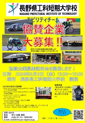 このたび本校の各種車両競技会に参加しているモビリティチームでは、今年度の協賛事業にご協力頂きました企業様及び2026年度の協賛事業にご関心をお寄せくださる企業様を対象とした、活動報告と次年度協賛金説明会を以下のとおり開催します。皆様のご参加、お待ちしております。